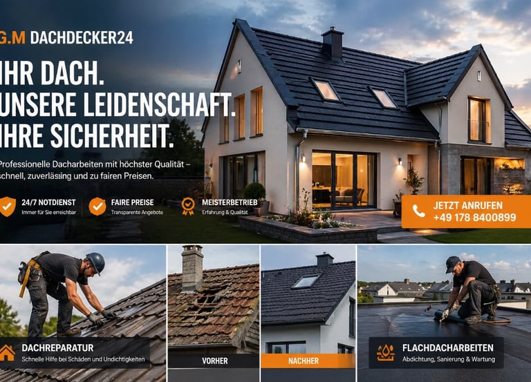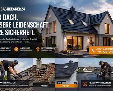 Schnelle Hilfe bei Dachreparaturen, Dachsanierungen, Neueindeckungen und Notdienst. Saubere Arbeit, faire Preise und schnelle Termine – 24 Stunden erreichbar.